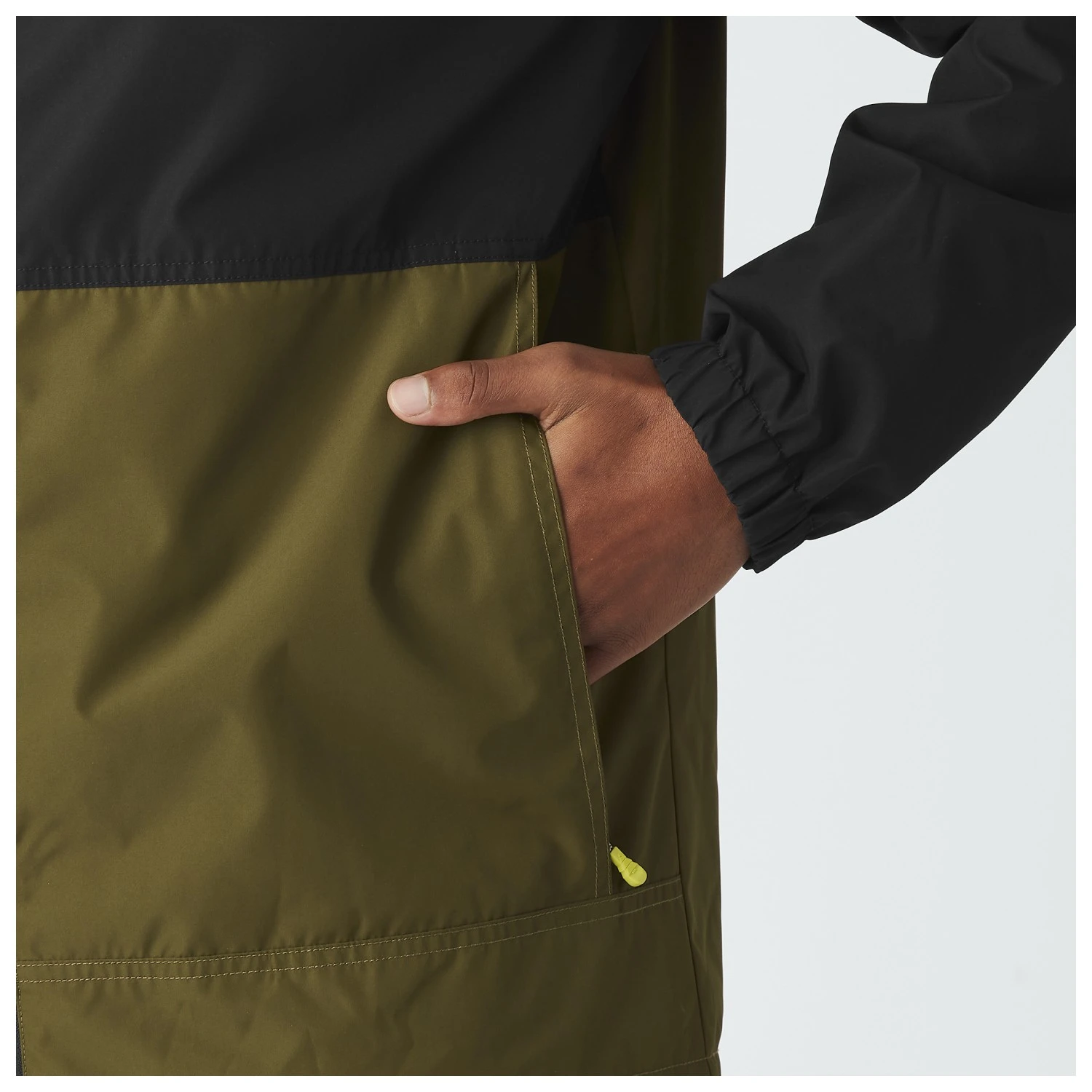 - elastic sleeve cuffs, stowable in its own pocket, drawstring in the seam